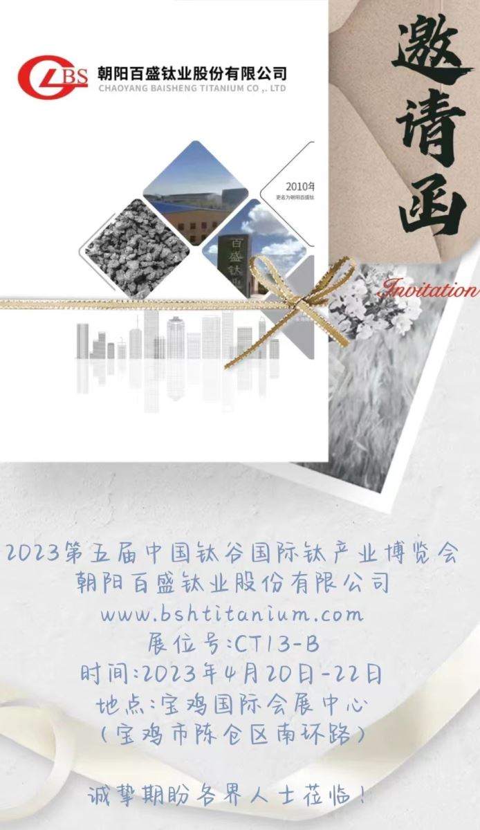 “第五屆中國鈦谷國際鈦產(chǎn)業(yè)博覽會”將于2023年4月20日-22日在寶雞國際會展中心舉辦,朝陽百盛鈦業(yè)作為參展商,用第一視角直擊全球規(guī)模最大的鈦行業(yè)盛會!</p> <p style="text-align:center"><img alt="" src="/userimages/images/222.jpg" /></p> <p style="text-align:center"> </p> <p>展位號:CT13-B</p> <p>時 間:2023年4月20日-22日</p> <p>地 點:寶雞國際會展中心</p> <p> (寶雞市陳倉區(qū)南環(huán)路)</p> <p> </p> <p>朝陽百盛鈦業(yè)股份有限公司誠摯期盼各界人士蒞臨!</p> " />